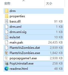 脱壳之后启动器和加密文件可以删除, 再把本体重命名为 PlantsVsZombies.exe ,可以删除的文件(夹): drm/ drm.xml drm.xml.sig PopUninstall.exe eula.txt readme.html.